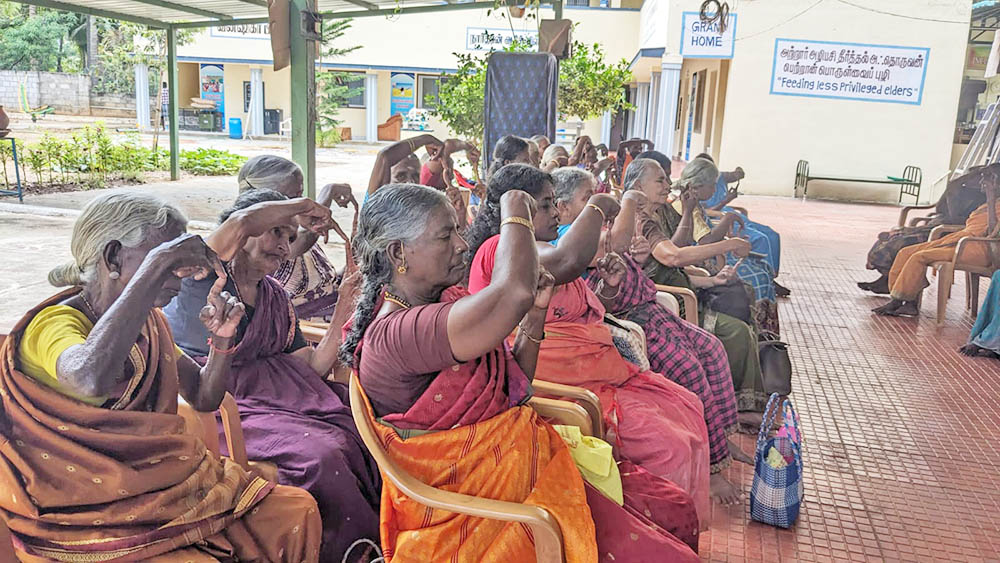 As committed last week, we started the session with a small warm-up exercise, followed by the Mudra practice that the elders had learned in the previous week, with the support of our trustee Mr. Kumar. After that, we trained the elders in chair exercises, which are very useful for senior citizens. These included simple movements for the legs, hands, fingers, neck, and other body parts. All the elders participated energetically and enthusiastically.